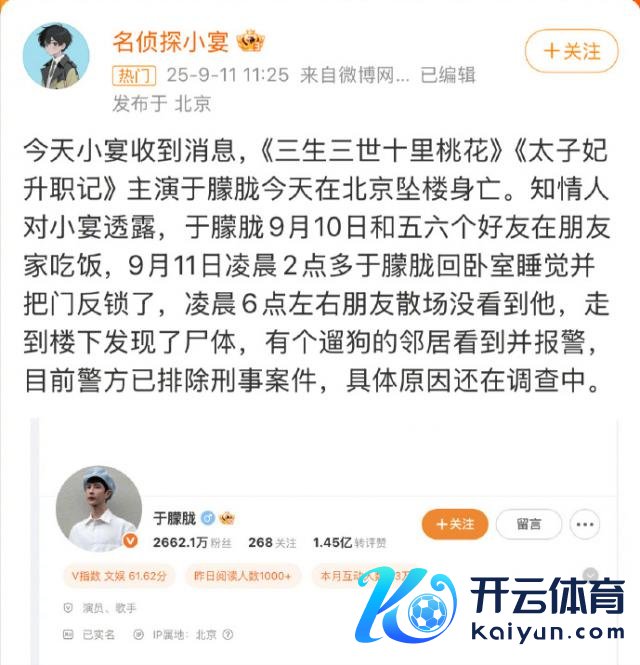 9 月 11 日上昼,有狗仔爆料于拖拉疑似在北京坠楼身一火。